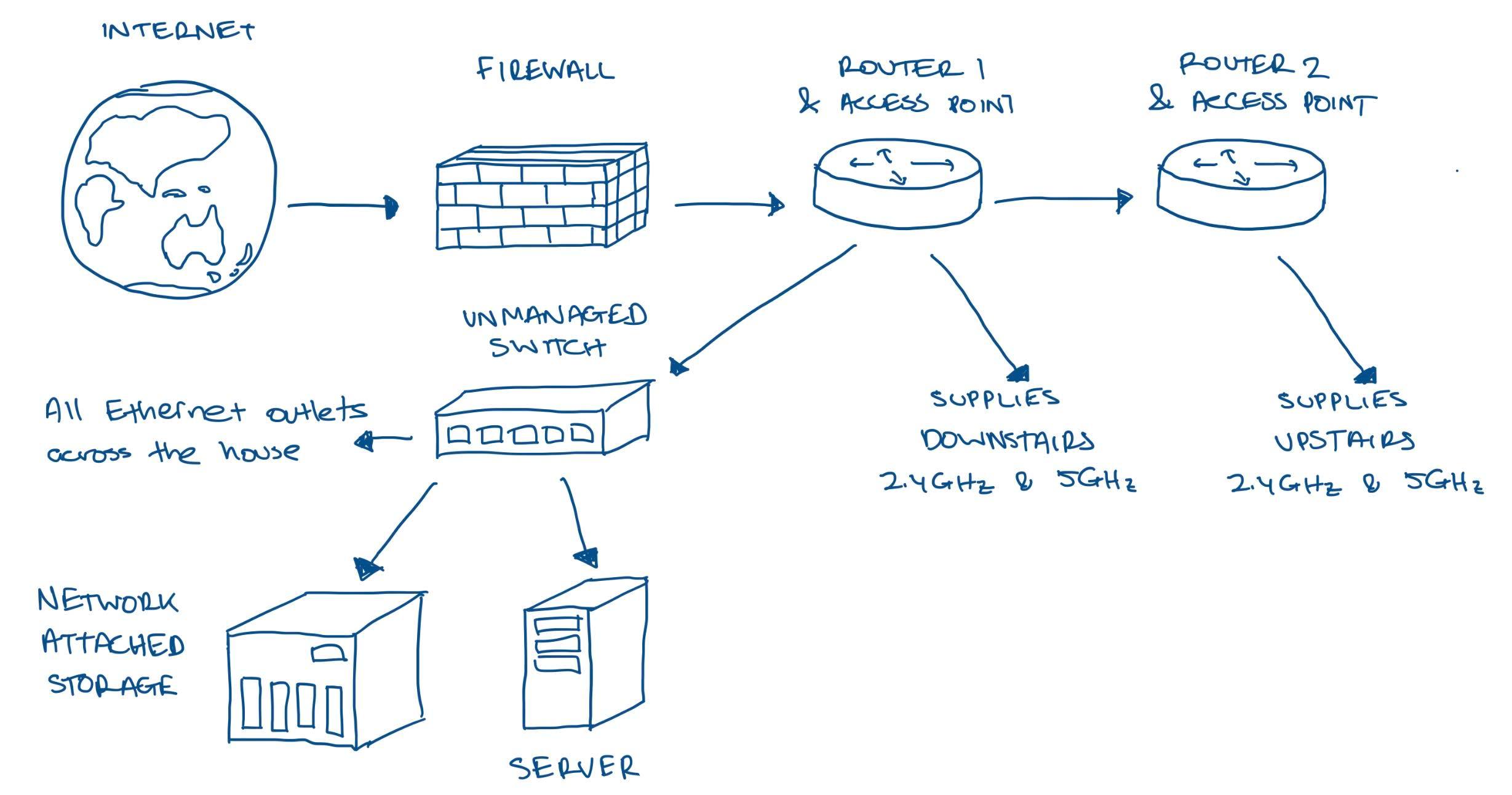 At the moment, I have my NBN connected (little more on this later) which is basically my internet connection from my ISP (company that provides me with internet access) to one wireless Asus router. This wireless Asus router is connected to another wireless Asus router to form a wifi mesh and the first router is also connected to an unmanaged switch to provide access to all the Ethernet ports littered over my house. The firewall on the initial router is set to “strict” and whatever ports that are blocked that I need access to, I manually open and close as I see fit.